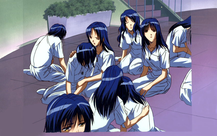 Stats: 1 layer, A1 KEY END Sketches: 1 matching, unstuck, + 2 layout sketches Background: Matching, unstuck Comments: SPOILER! Some of the many mass created Tennyo at the Mikage building. They're always beautiful, but they're dying here so it's just sad. This is one of the few group shots just as they silently decide to self-destruct together rather than being taken by the soldiers (the last of the shots, before the big kaboom starts building). I'll probably scan the sketch eventually, because it's very purdy as well. The background is a a bit splotchy in the scan, it couldn't be helped. |